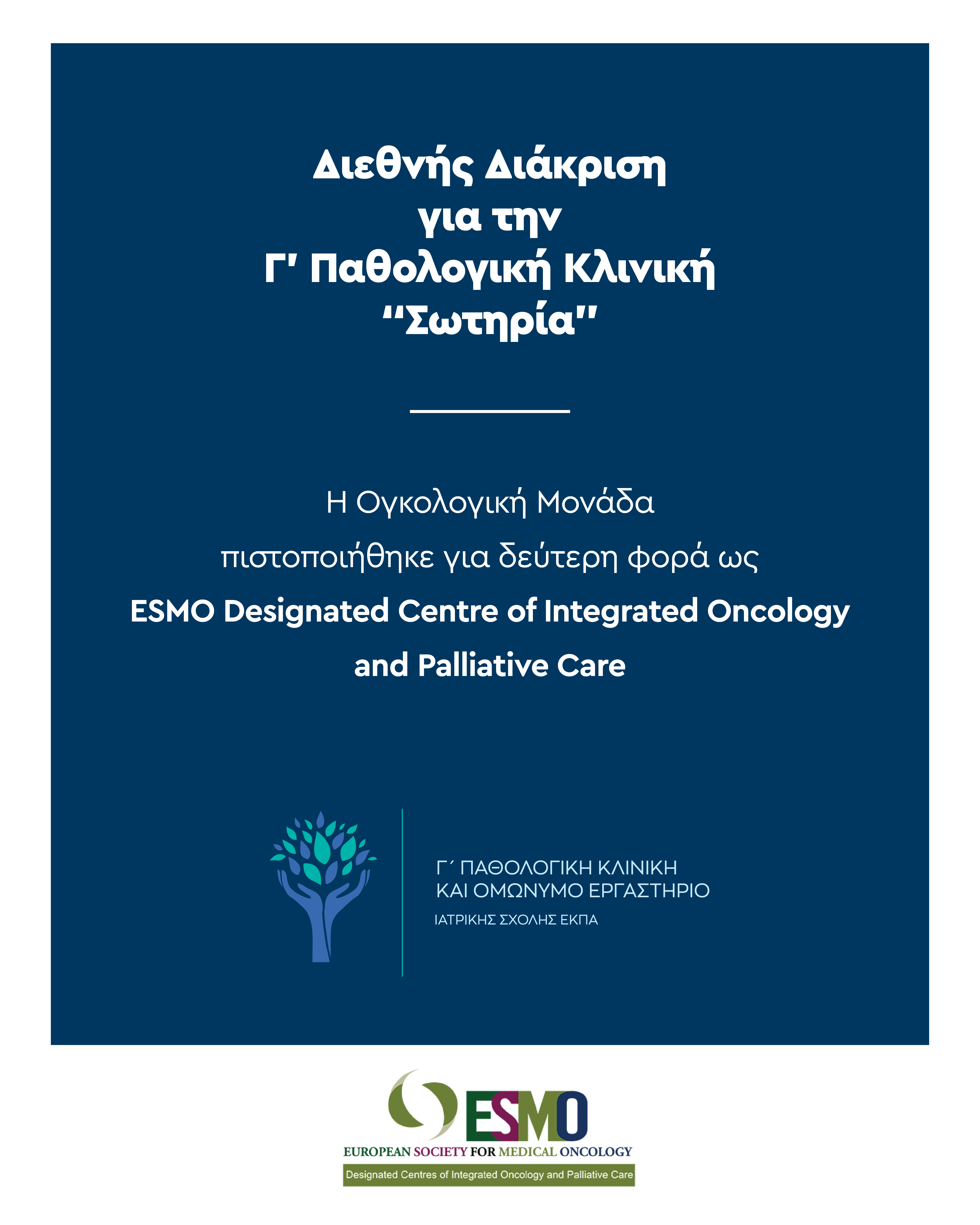 Με ιδιαίτερη χαρά και περηφάνια ανακοινώνουμε ότι η Ογκολογική Μονάδα της Γ’ Παθολογικής Κλινικής του Εθνικού και Καποδιστριακού Πανεπιστημίου Αθηνών πιστοποιήθηκε για δεύτερη συνεχή φορά ως ESMO Designated Centre of Integrated Oncology and Palliative Care.